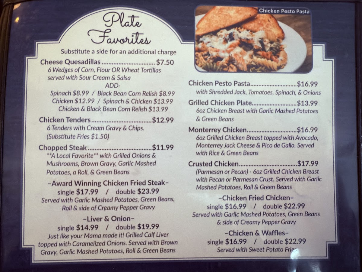- Familiar comfort foods such as chicken and waffles or basket-style sweet potato fries